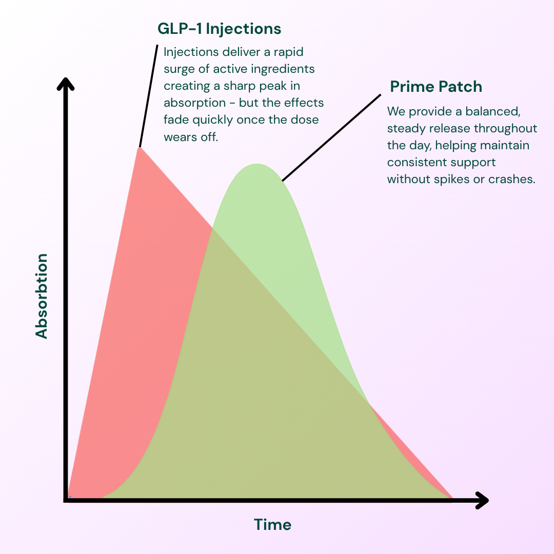 Prime Patch is not a medication. It's a wellness patch inspired by GLP-1 science, using natural ingredients like Berberine to support your body's own appetite-regulating pathways - without needles, prescriptions, or harsh side effects.